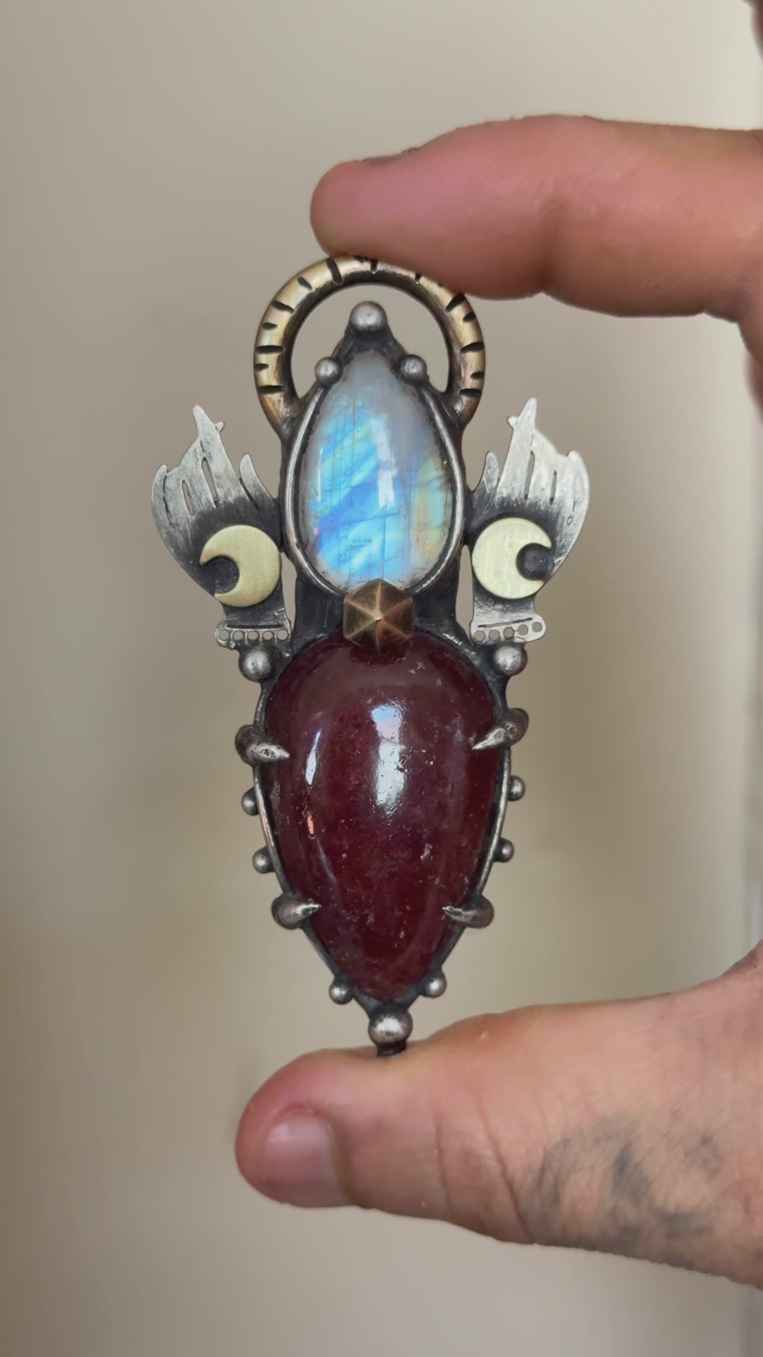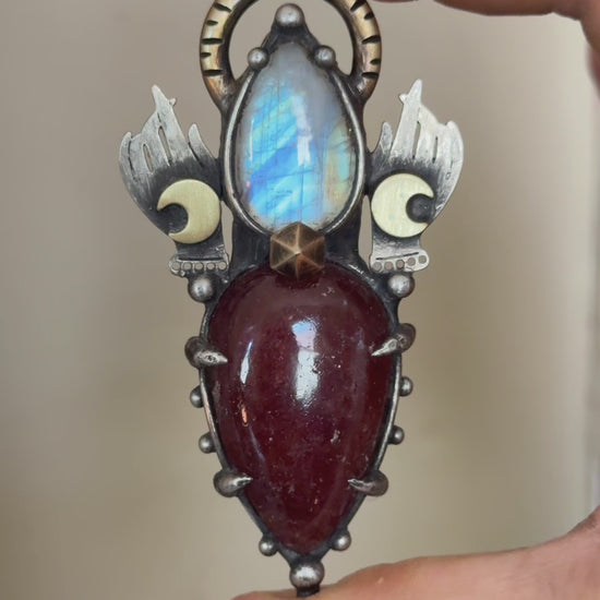 This Rainbow Moonstone and Strawberry Quartz necklace is crafted using the method called tiffany technique. The process consists of using lead-free silver solder. The pendant is held by a stainless steel chain that may be altered to any length upon request. Please refer to photos to size.