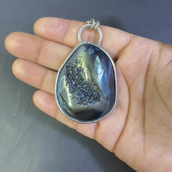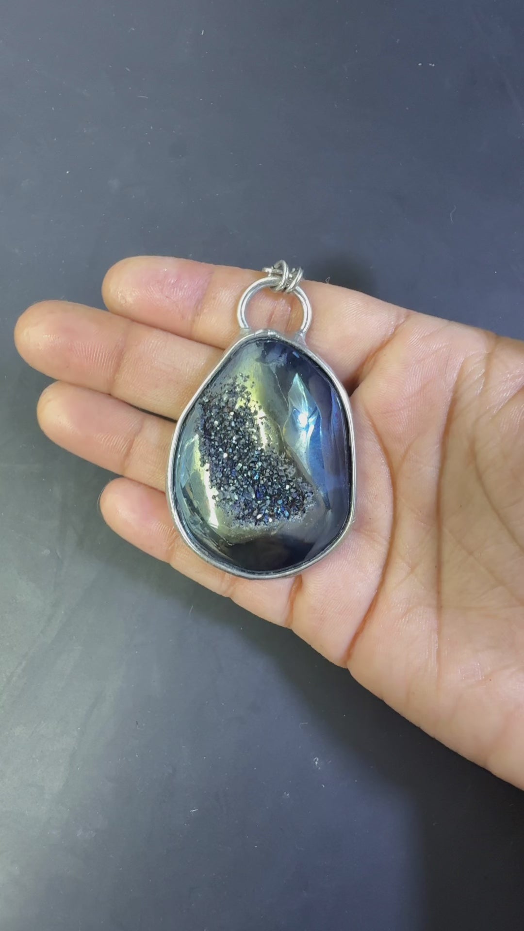 This Blue Titanium Druzy Agate pendant is crafted using the method called tiffany technique. The process consists of using lead-free silver solder.