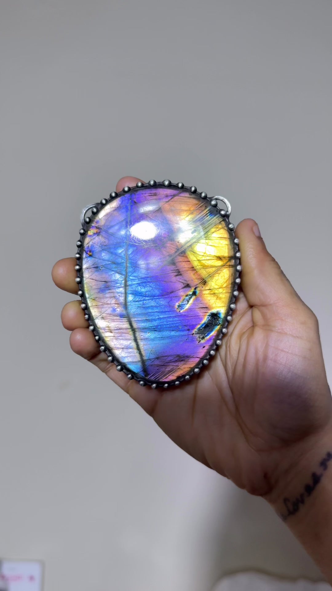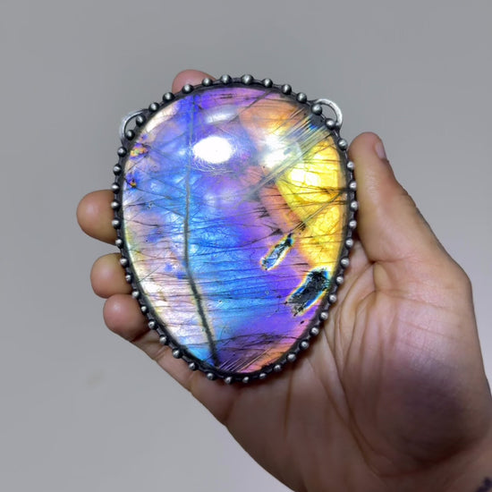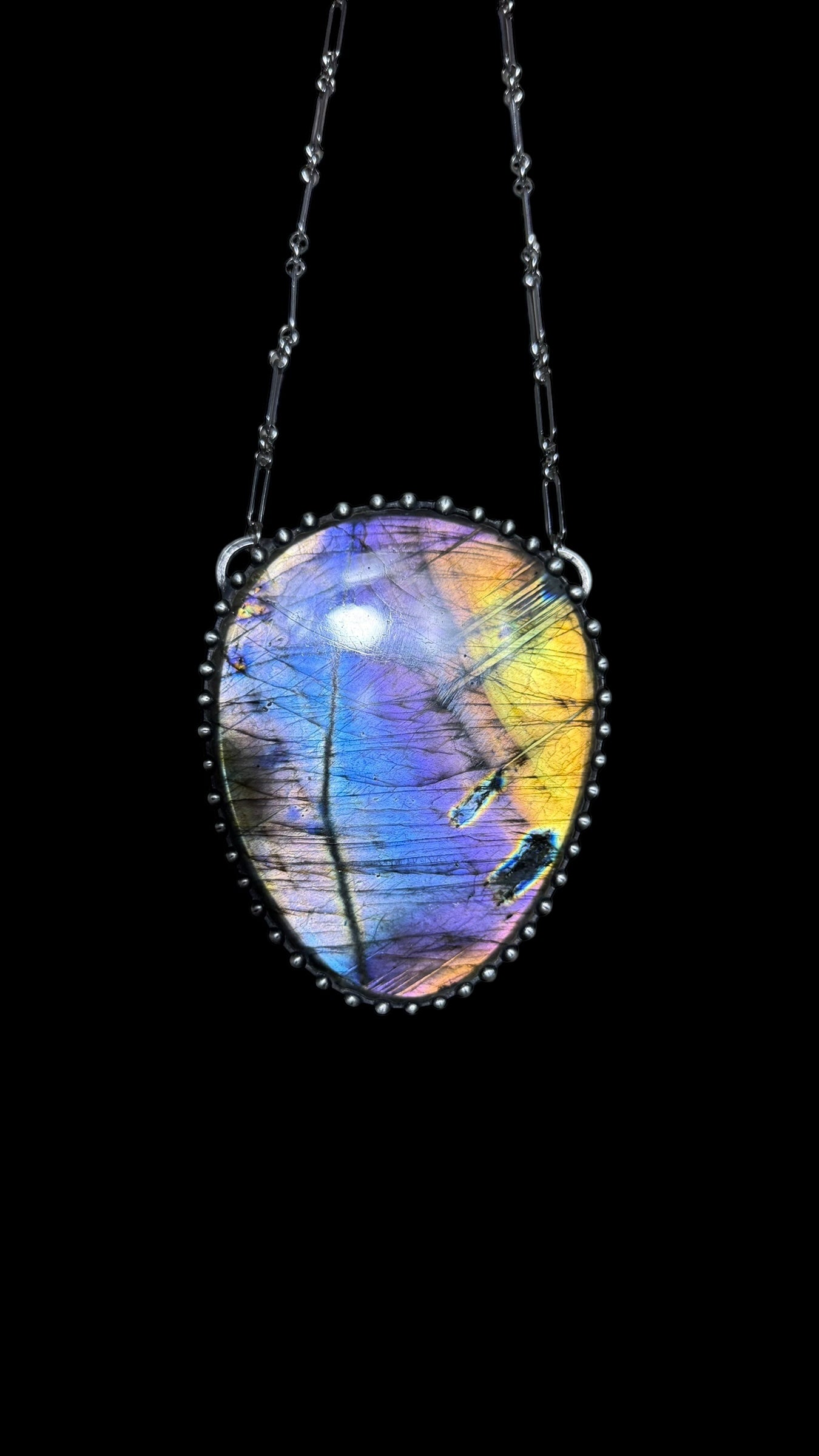 This Labradorite pendant is crafted using the method called tiffany technique. The process consists of using lead-free silver solder. Each piece is oxidized using black patina which gives it an aged yet timeless appearance.