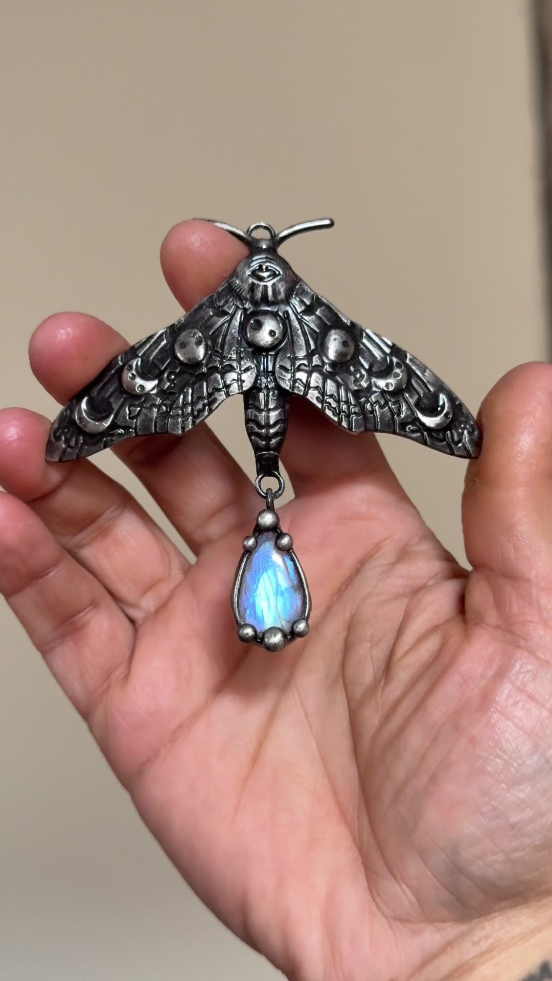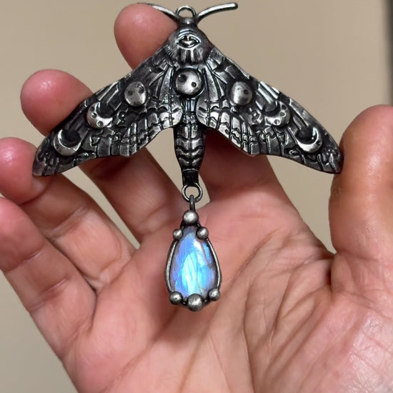 This Rainbow Moonstone necklace is crafted using the method called tiffany technique. The process consists of using lead-free silver solder. The pendant is held by a stainless steel chain that may be altered to any length upon request. Please refer to photos to size.