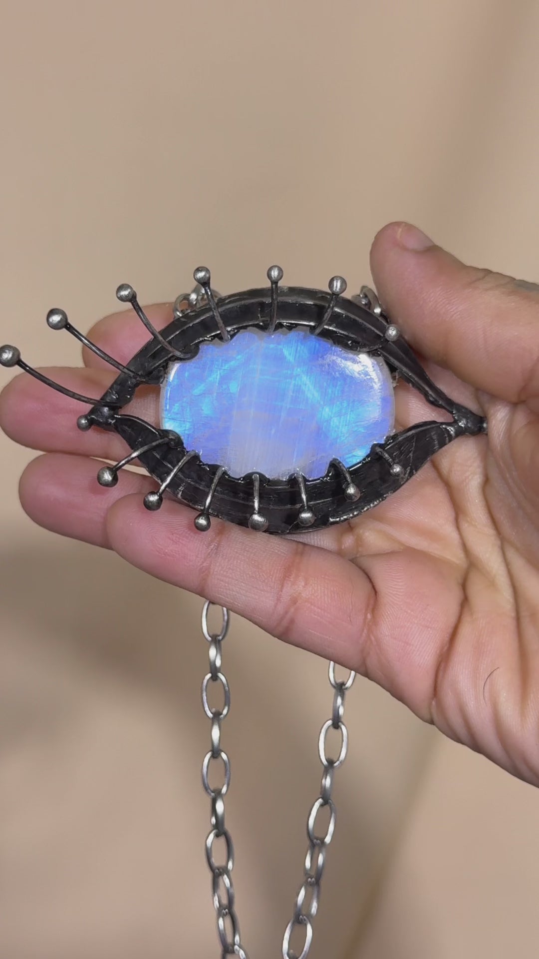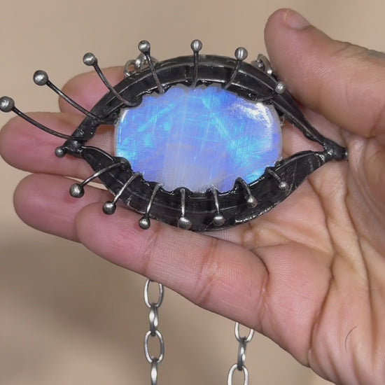 This Rainbow Moonstone necklace is crafted using the method called tiffany technique. The process consists of using lead-free silver solder. The pendant is held by a stainless steel chain that may be altered to any length upon request. Please refer to photos to size.