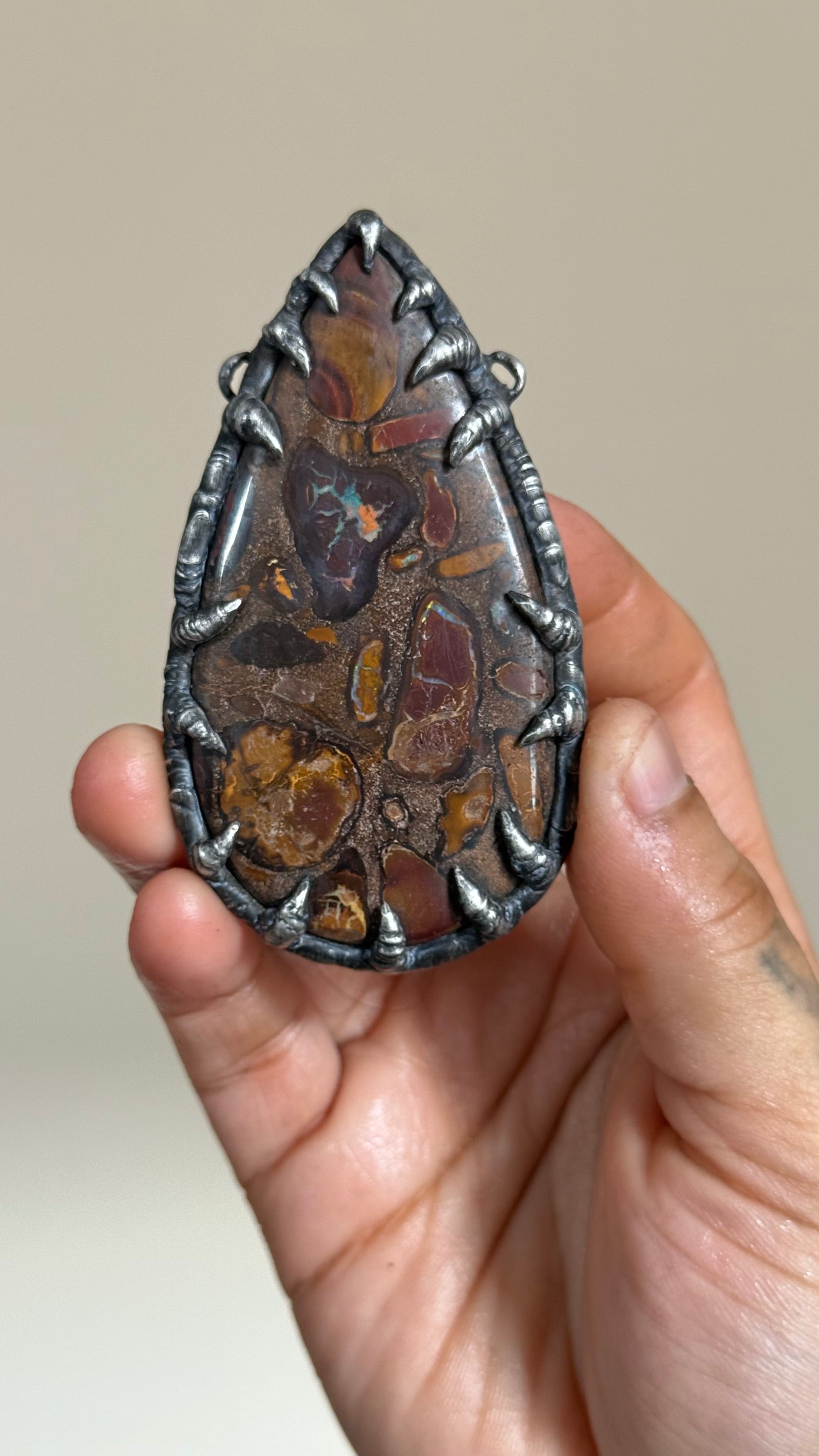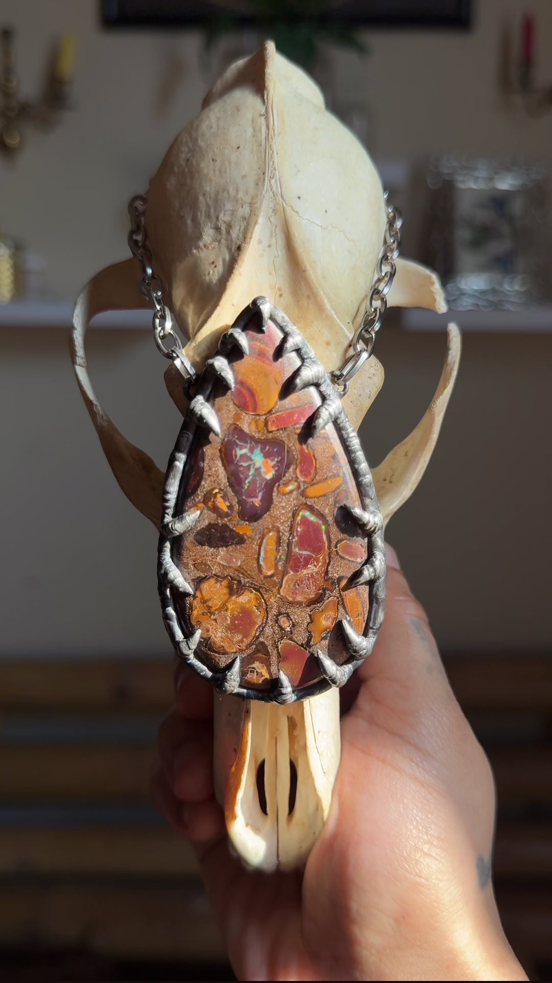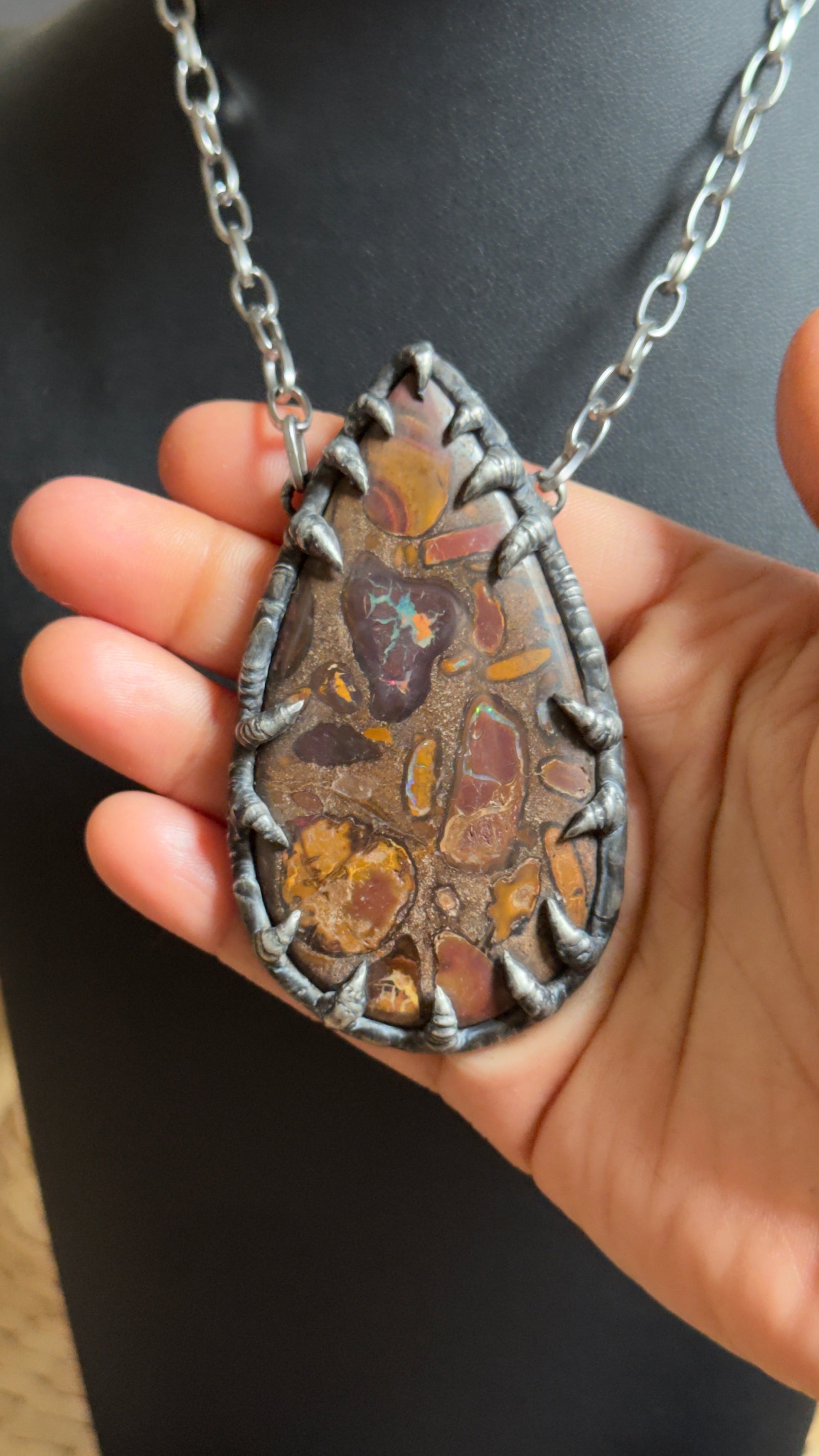 This Boulder Opal necklace is crafted using the method called tiffany technique. The process consists of using lead-free silver solder. The pendant is held by a stainless steel chain that may be altered to any length upon request. Please refer to photos to size.
