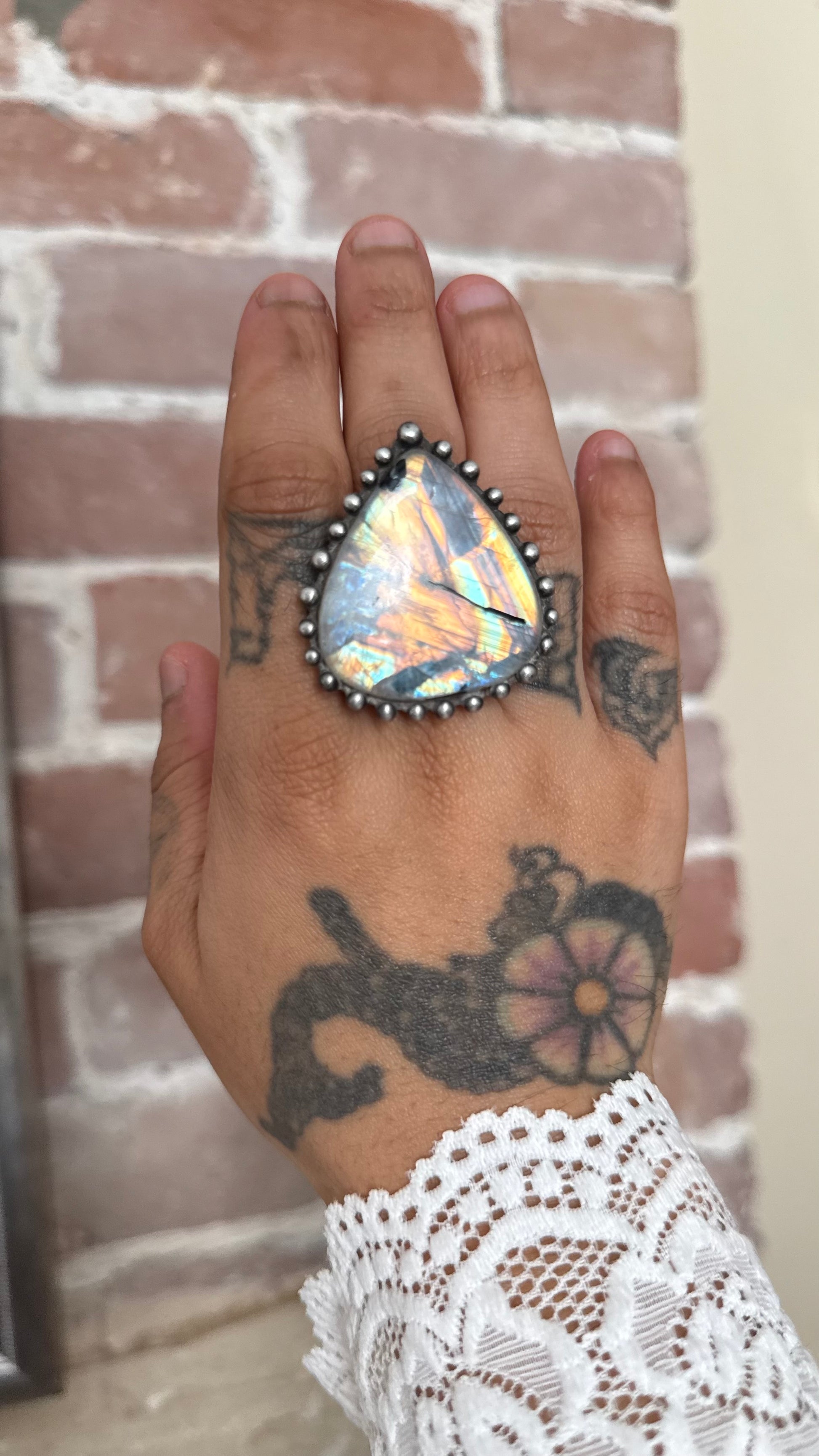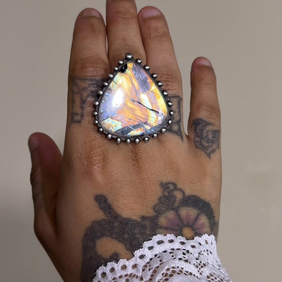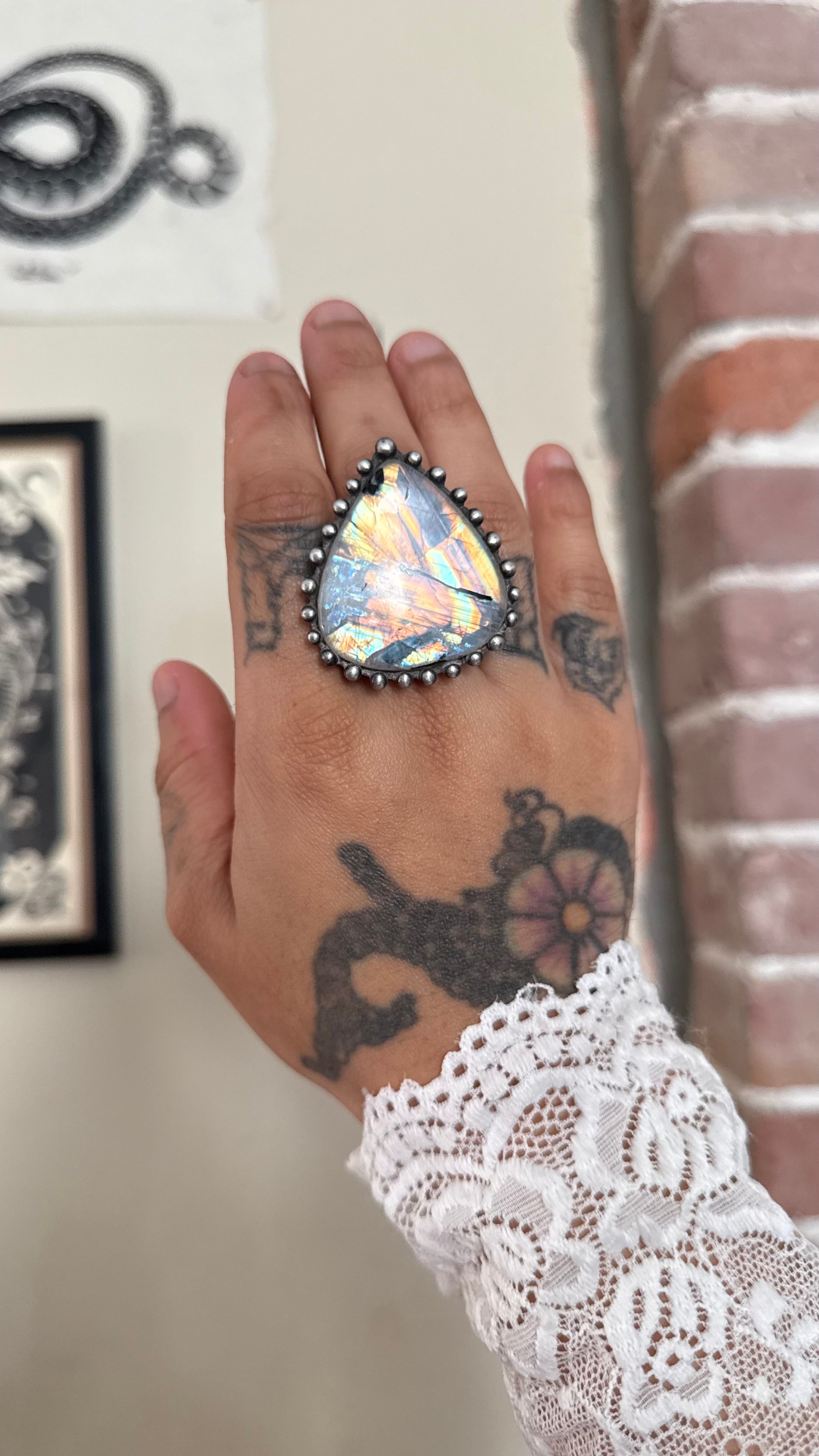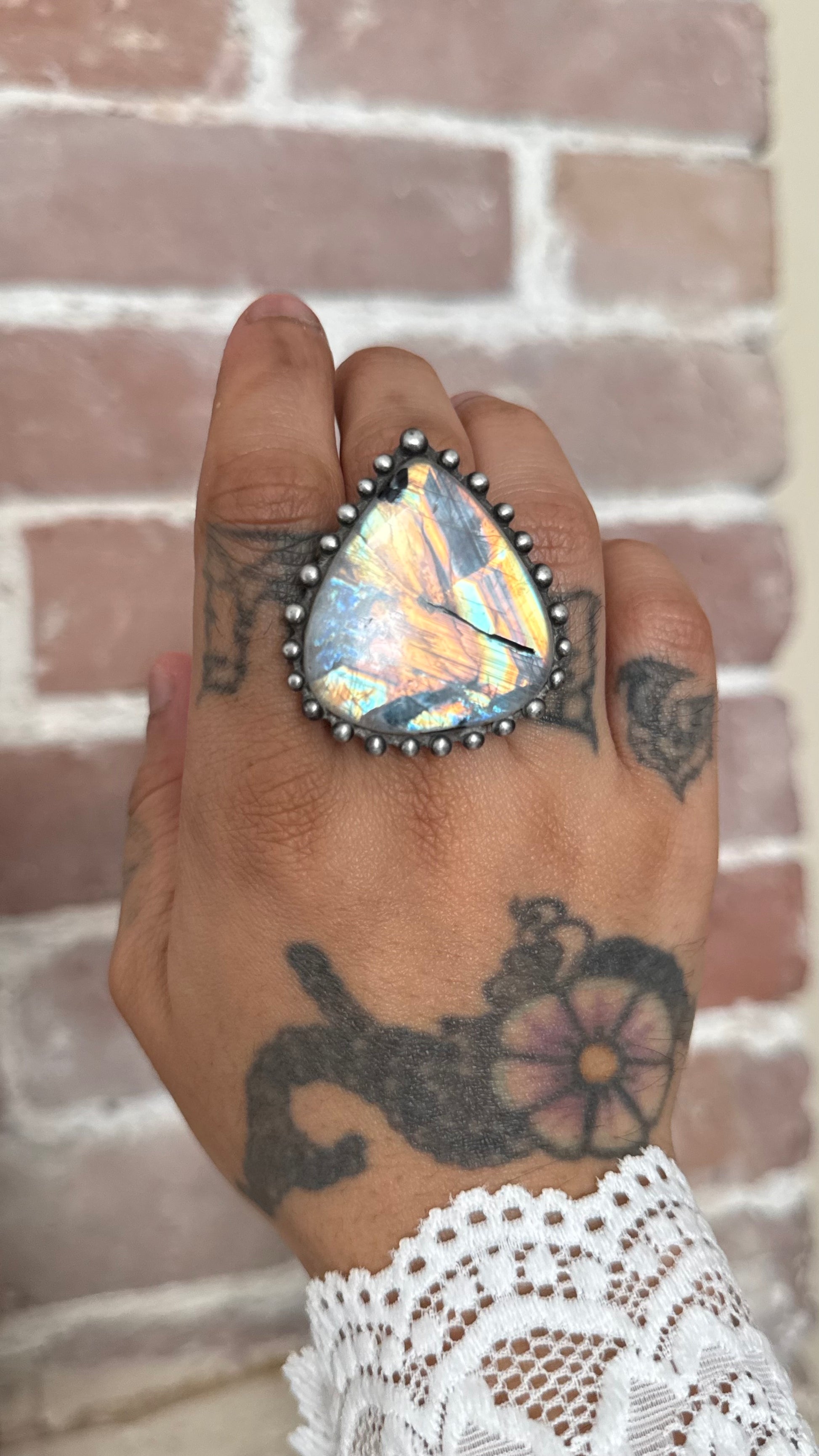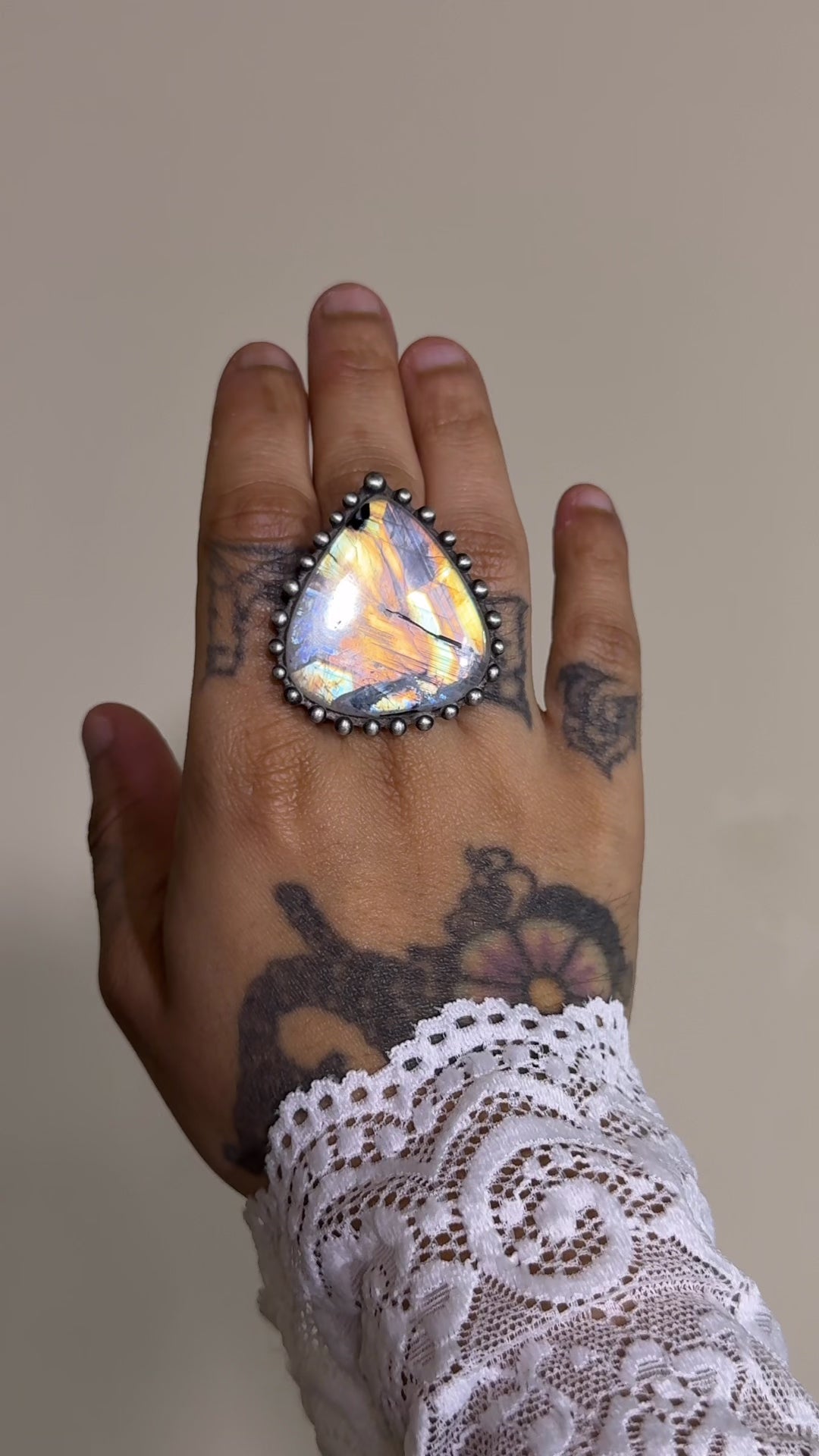 A Rainbow Moonstone ring crafted using the method called tiffany technique. The process consists of using lead-free silver solder. Each piece is oxidized using black patina which gives it an aged yet timeless appearance. The ring is adjustable in size and has a thick ring band for durability. If you would like to provide your ring size I can shape the band according to your preferred size upon request.