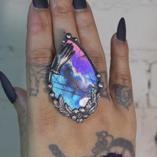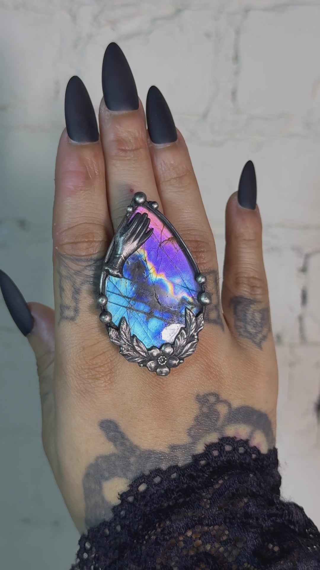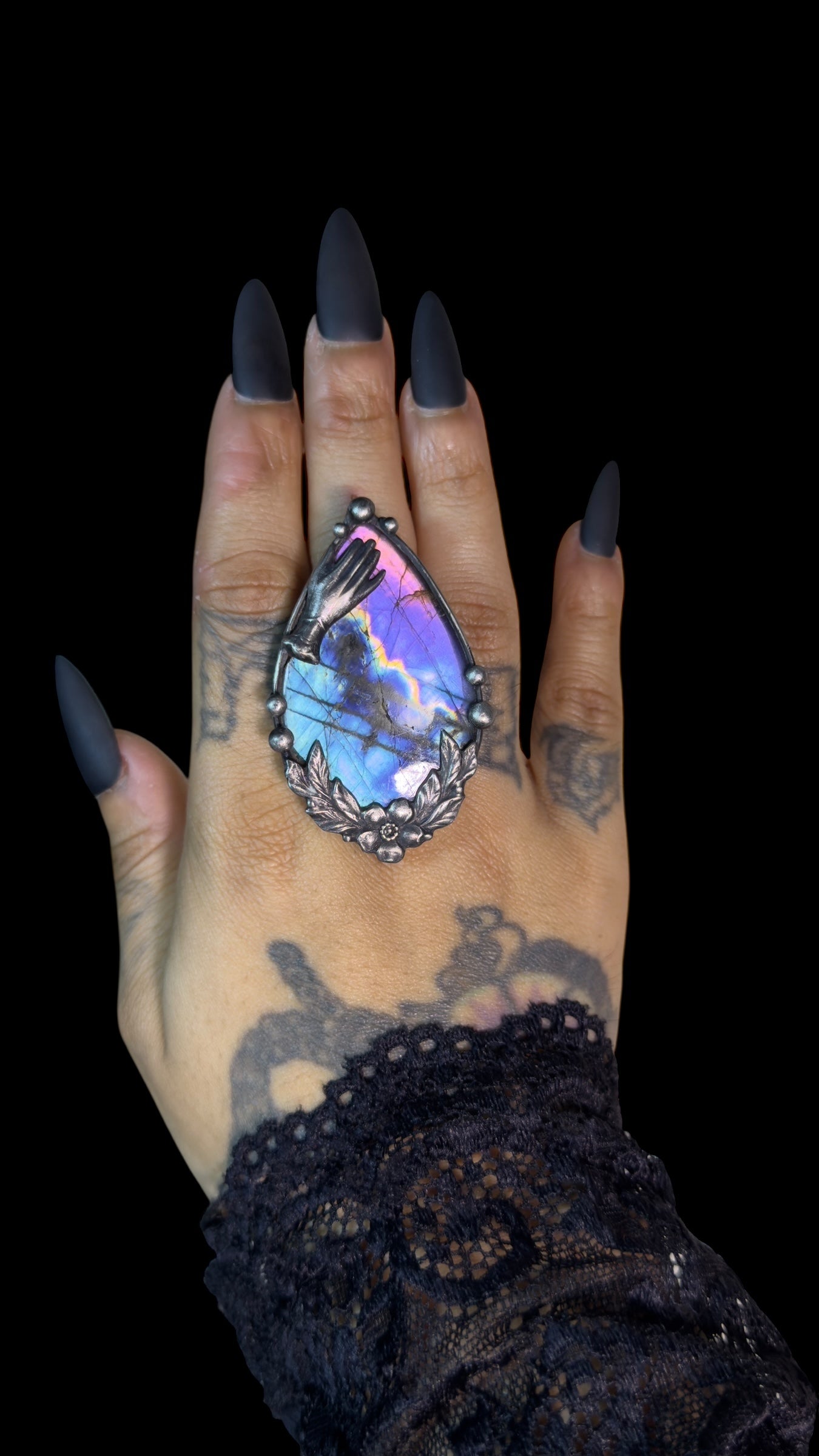 This Labradorite ring is crafted using the method called tiffany technique. The process consists of using lead-free silver solder. Each piece is oxidized using black patina which gives it an aged yet timeless appearance. The ring is adjustable in size and has a thick ring band for durability. If you would like to provide your ring size I can shape the band according to your preferred size upon request.