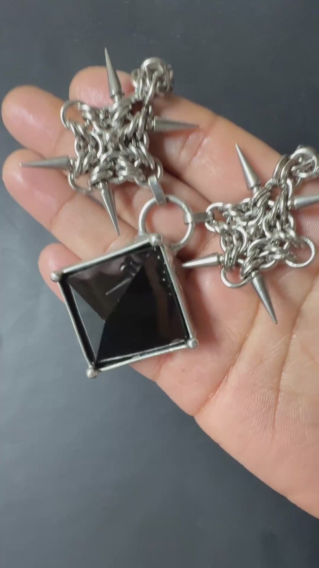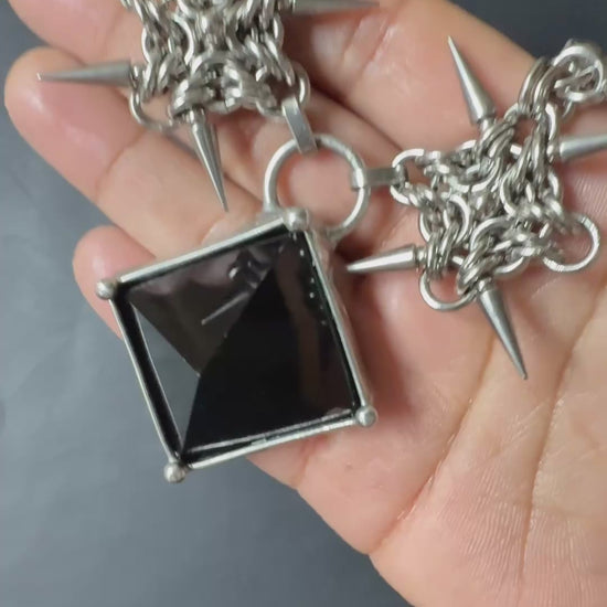 This chainmail necklace is woven from thick-gauge stainless steel rings, offering exceptional strength and durability. The dense chain mail is paired with an Obsidian stone as a centerpiece and accented with spike details. Made with highly tarnish-resistant, hypoallergenic stainless steel, this piece is built to last both in design and wear.