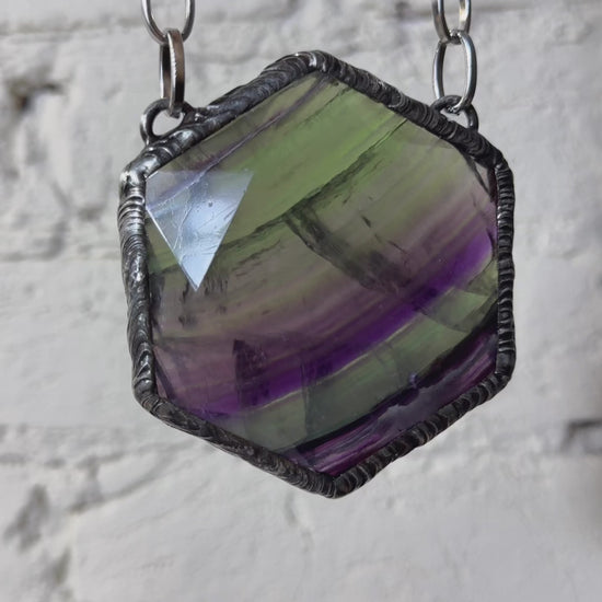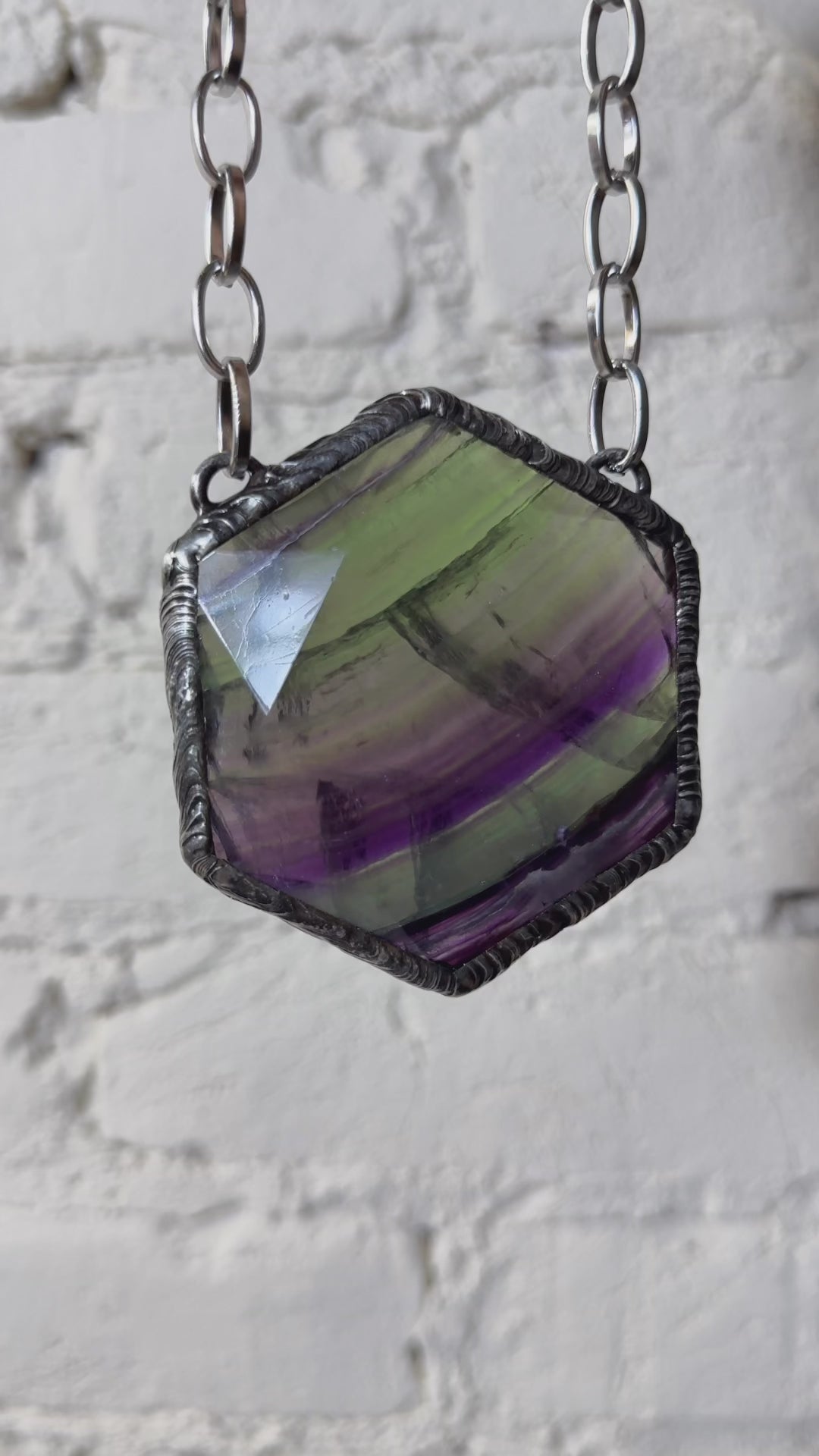 This Fluorite pendant is crafted using the method called tiffany technique. The process consists of using lead-free silver solder. Each piece is oxidized using black patina which gives it an aged yet timeless appearance.
