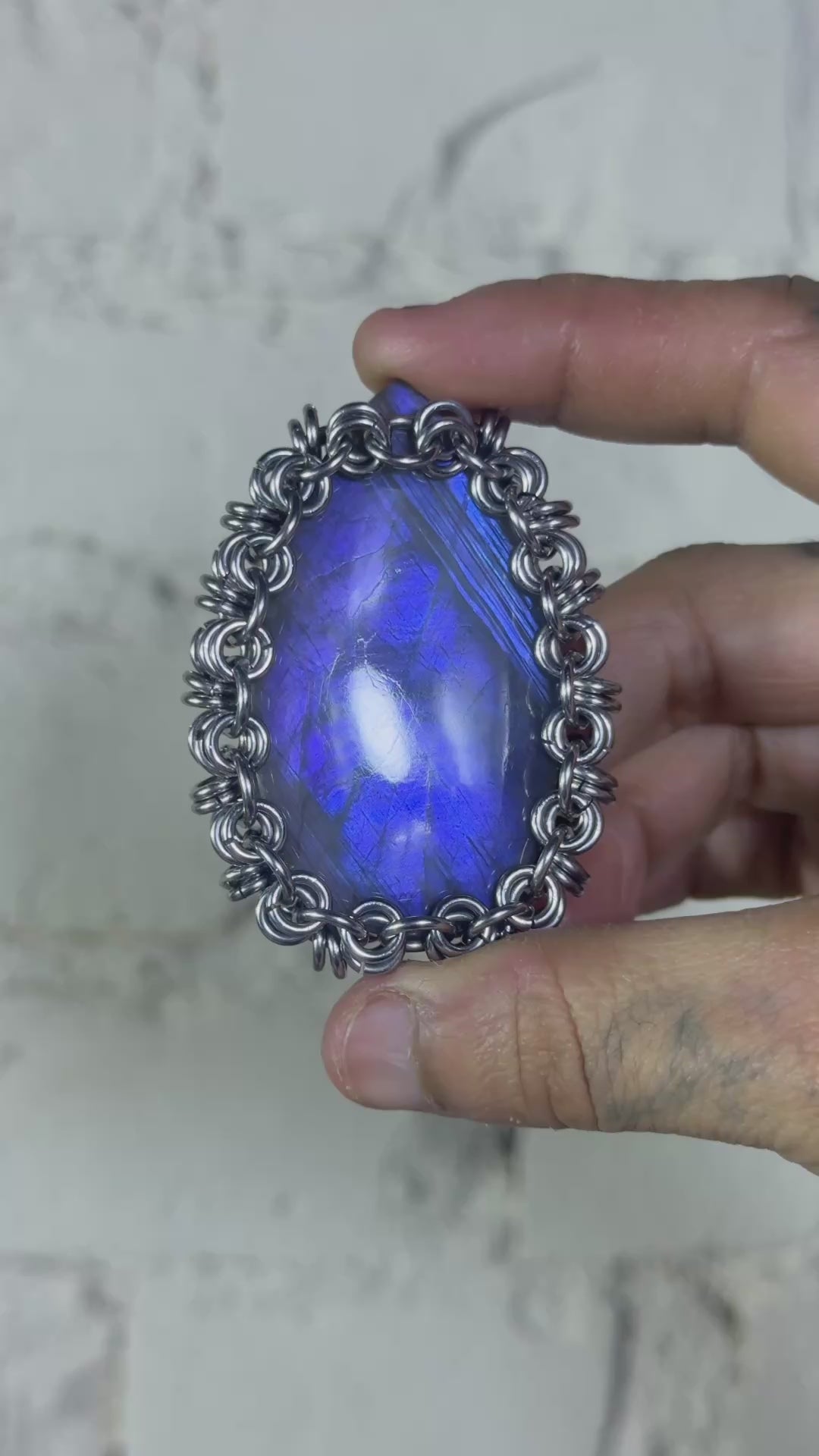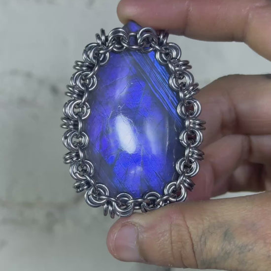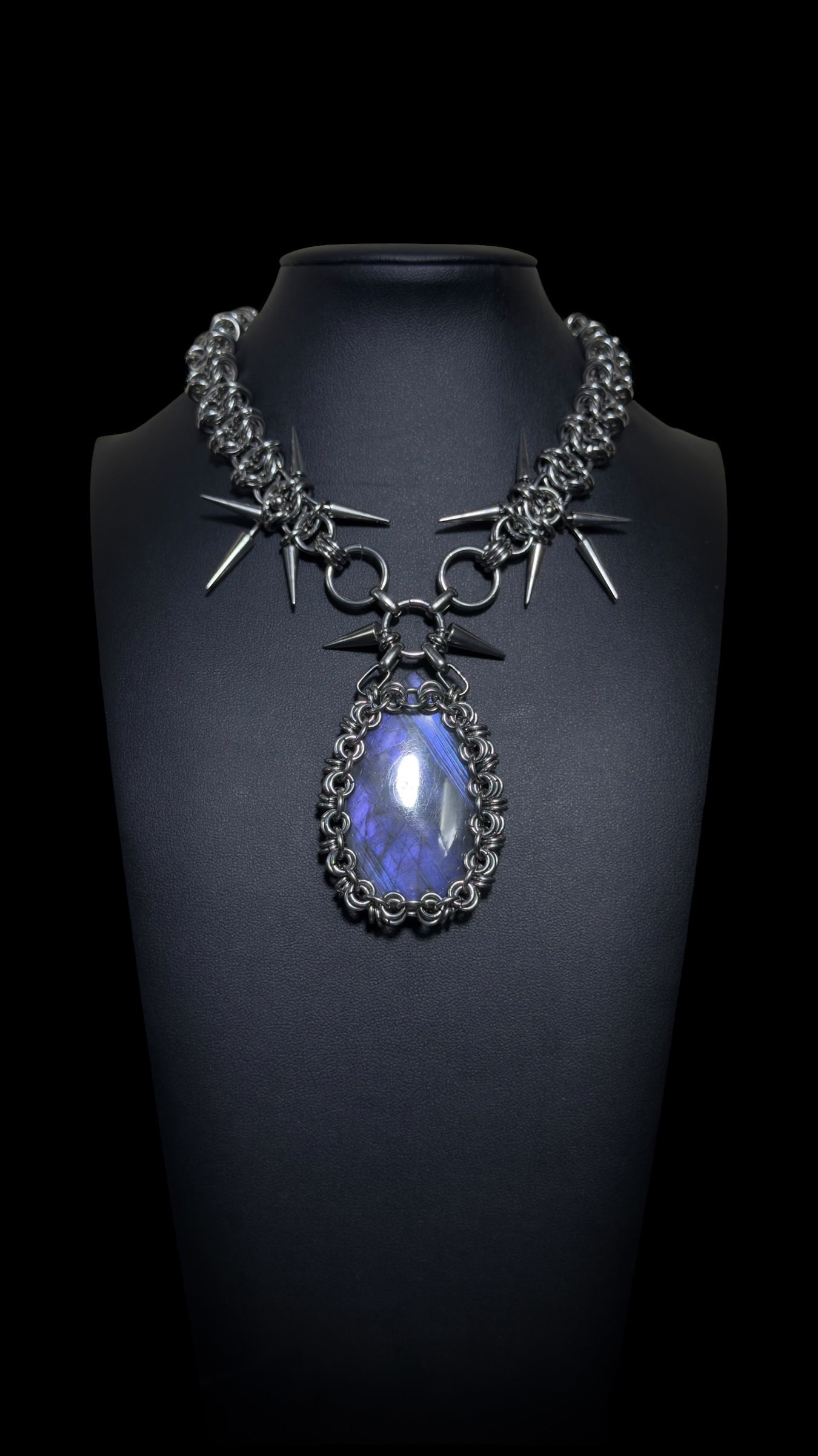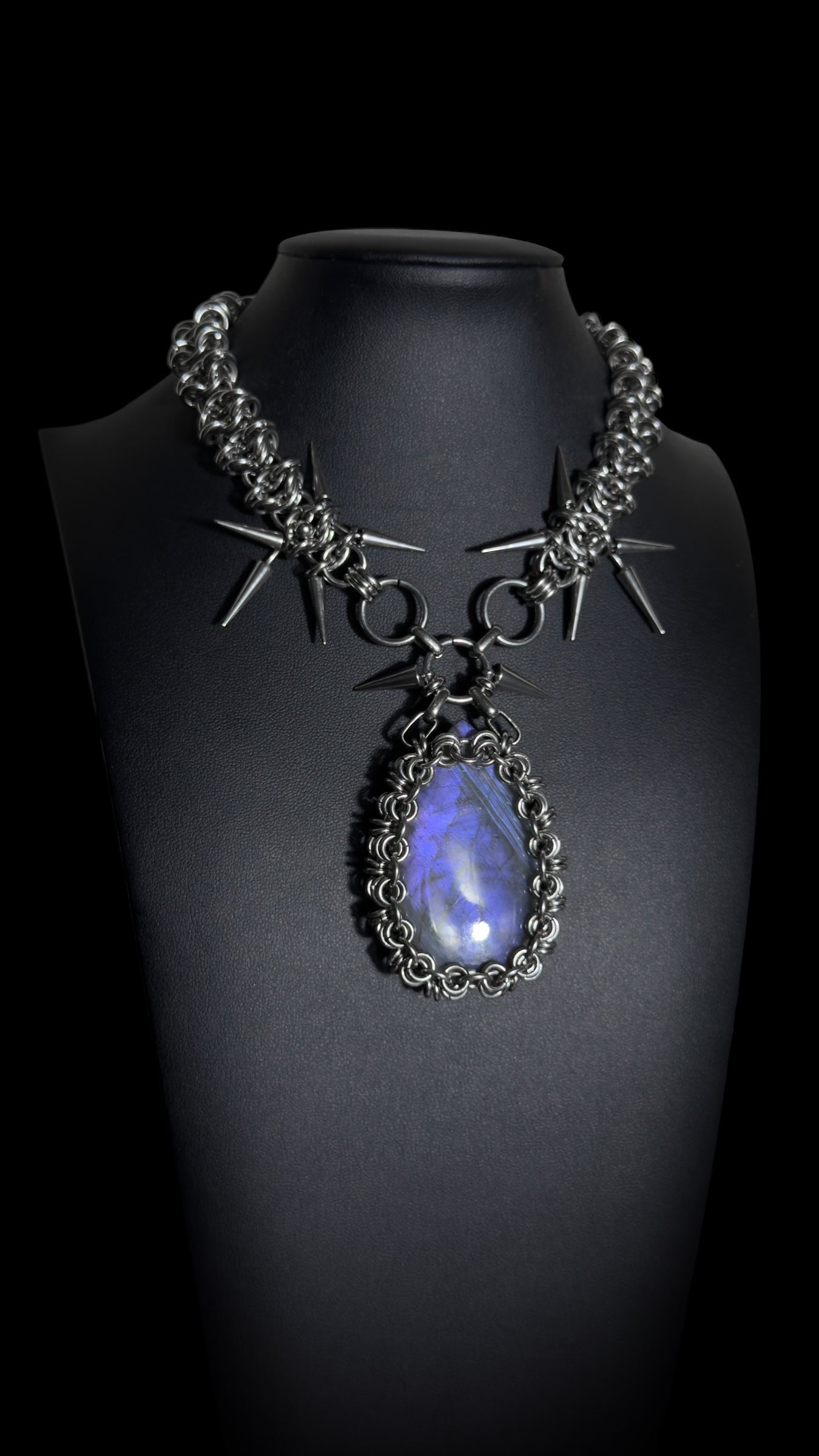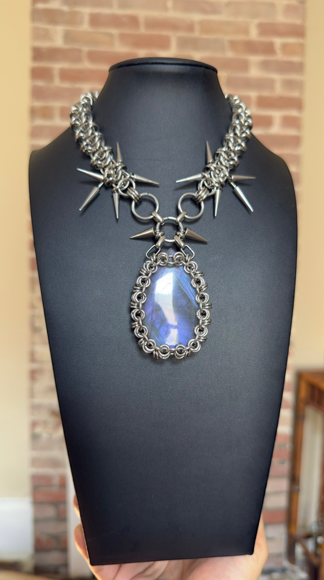 This chainmaille necklace is woven from thick-gauge stainless steel rings, offering exceptional strength and durability. The dense chainmaille is paired with a vibrant Labradorite centerpiece. Made with highly tarnish-resistant, hypoallergenic stainless steel, this piece is built to last both in design and wear.