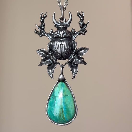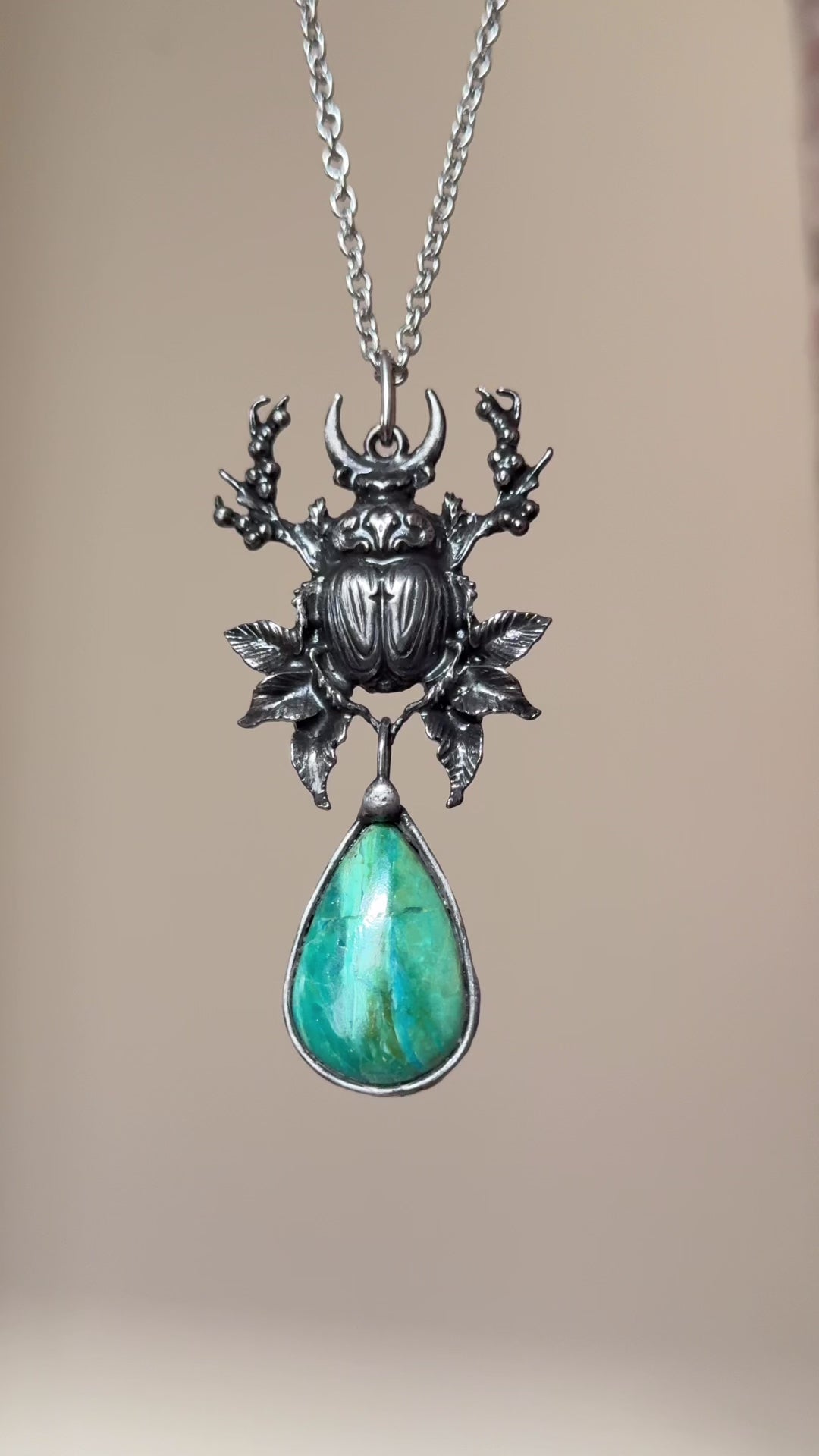 This Chrysocolla necklace is crafted using the method called tiffany technique. The process consists of using lead-free silver solder. The pendant is held by a stainless steel chain that may be altered to any length upon request. Please refer to photos to size.