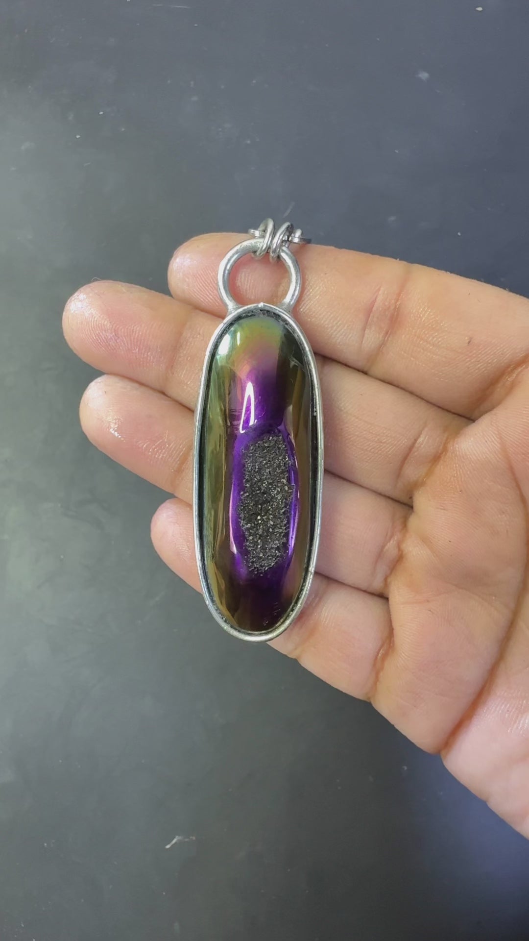 This Rainbow Titanium Druzy Agate pendant is crafted using the method called tiffany technique. The process consists of using lead-free silver solder.