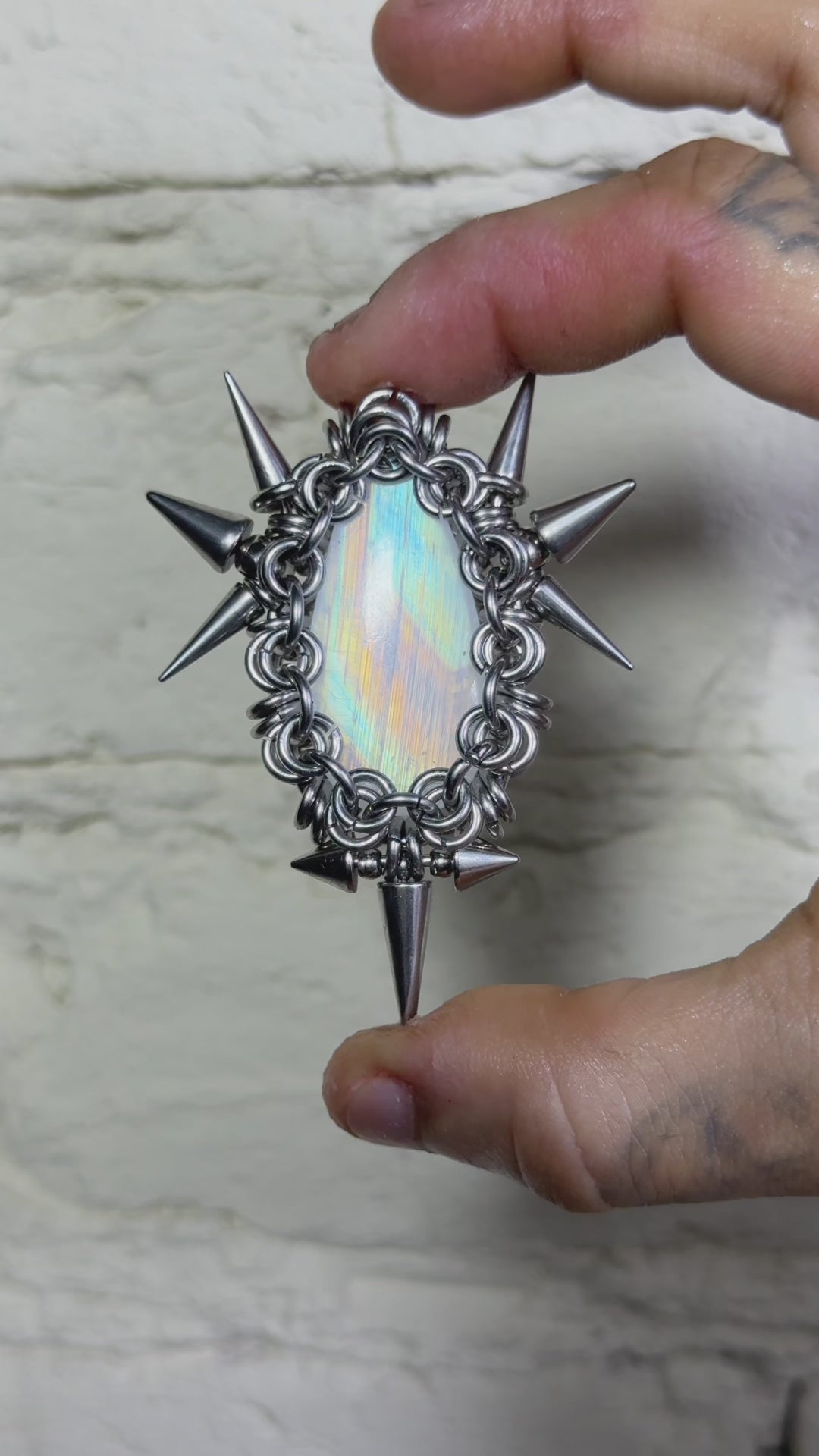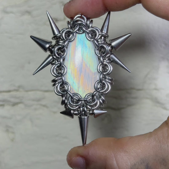 This chainmail necklace is woven from thick-gauge stainless steel rings, offering exceptional strength and durability. The dense chain mail is paired with a luminous, Rainbow Moonstone centerpiece and accented with layered chains and spike details.